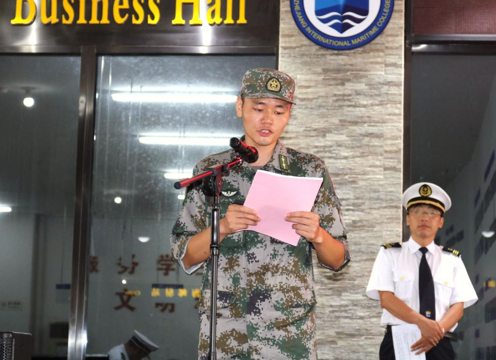 航海工程学院2017级航海技术1区队施挺同学代表老生发言。他鼓励学弟学妹们勇于探索尝试、勇于成为主人、学会承担责任、更要坚守本心,努力学习,在海运度过人生中最美好的大学时光。