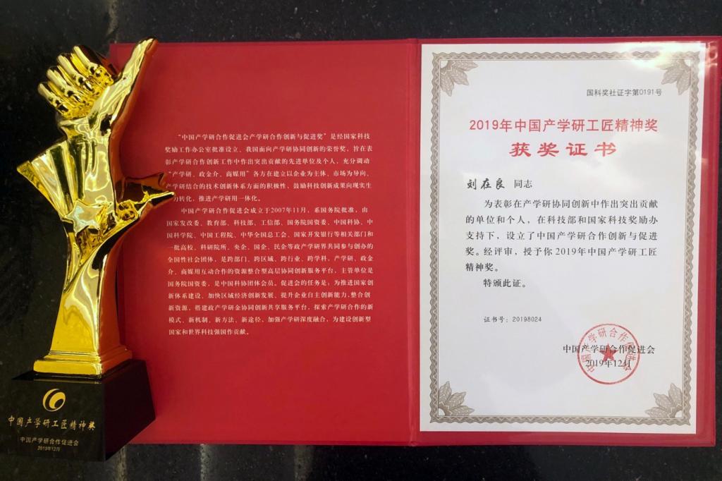 产学研合作创新与促进奖每年评选一次,其中,“中国产学研工匠精神奖”授予产学研一线涌现出的能工巧匠和技术骨干,表彰他们敬业、专注、创新,为中国制造迈向世界舞台做出的重要贡献。今年大会以“创新科技、融合发展、勇攀高峰”为主题,由中国产学研合作促进会主办,得到了国家发改委、科技部、教育部、工业和信息化部、中国科协、中国科学院、中国工程院等相关部门支持和指导。全国人大原副委员长陈至立女士,全国科协主席万钢、全国政协副主席王钦敏,工信部原部长李毅中、工信部副部长辛国斌、对外联络部原副部长周力、李安东上将等国家领导人出席了大会。会议还表彰了2019年在产学研合作、成果转化、军民融合、工匠精神等方面做出贡献的先进单位和个人。