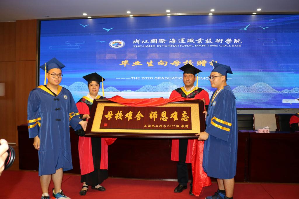 校党委委员、纪委书记江爱芬代表学校接受了石油化工学院2020届毕业生向学校赠送的礼物。