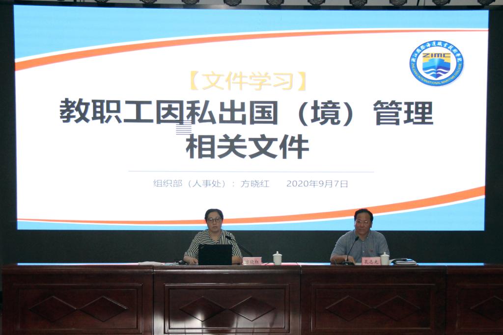 党委委员、组织部(人事处)部长(处长)方晓红传达学习和解读了党中央、省、市和学校党委关于因私出国(境)管理的最新文件精神,要求大家要提高政治站位,认真学习和严格遵守相关规定。