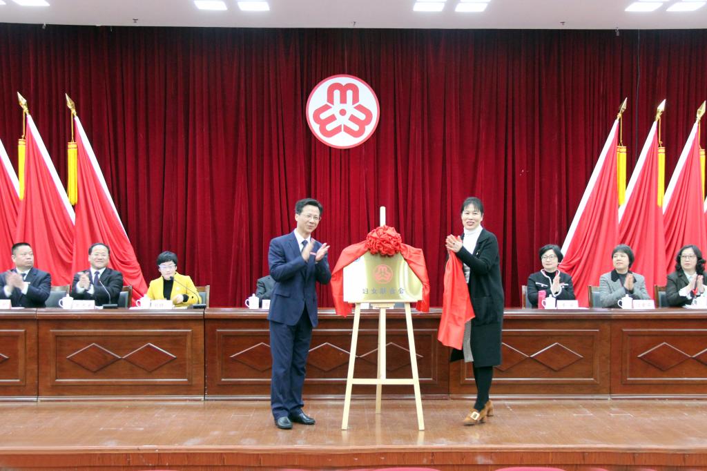 在热烈的掌声中,学校党委副书记、校长吴中平和舟山市教育局妇工委主任张莺共同为我校妇女联合会成立揭牌。
