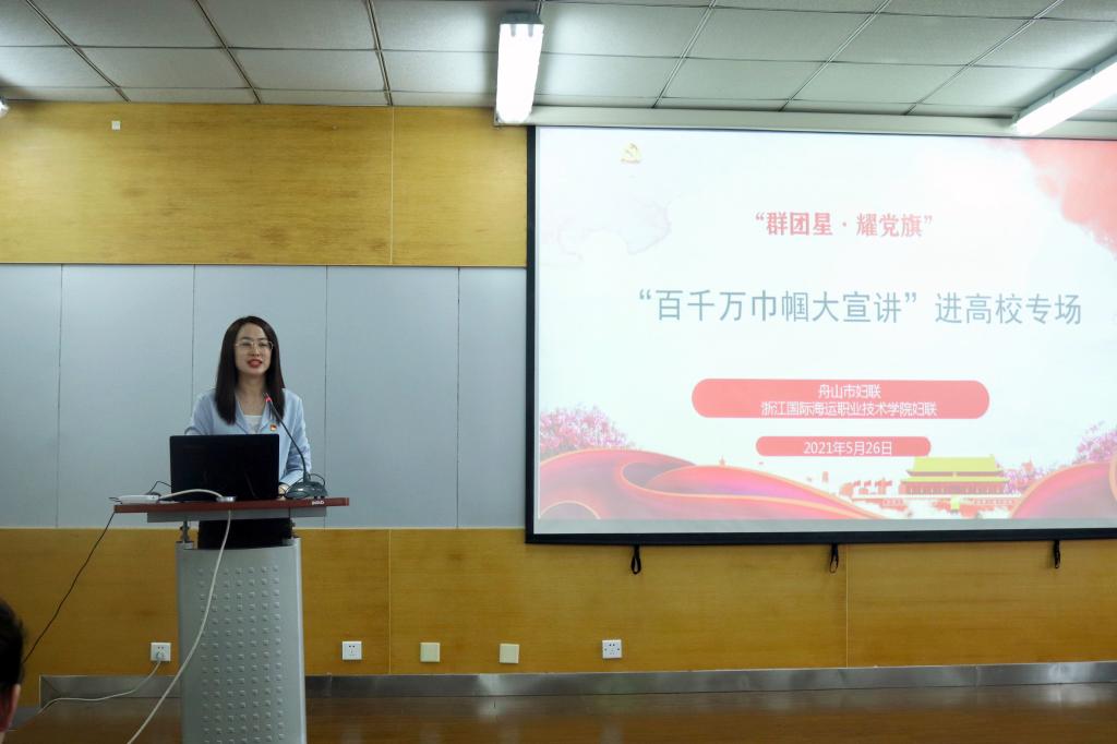526日下午,由舟山市妇联主办、我校妇联协办、海洋旅游学院承办的“百千万巾帼大宣讲”进高校专场宣讲会在国际海员培训楼三楼会议隆重举行。本次活动也是全市“群团星·耀党旗”宣讲行动,旨在讲好浙江革命红船启航地的故事、改革开放先行地的故事、习近平新时代中国特色社会主义思想重要萌发地的故事,讲好“八八战略”一张蓝图绘到底的故事和身边榜样典型的感人故事,推进宣讲进企业、进农村、进机关、进校园、进社区、进网络,充分展示巾帼宣讲员风采,为建党100周年营造浓厚氛围。