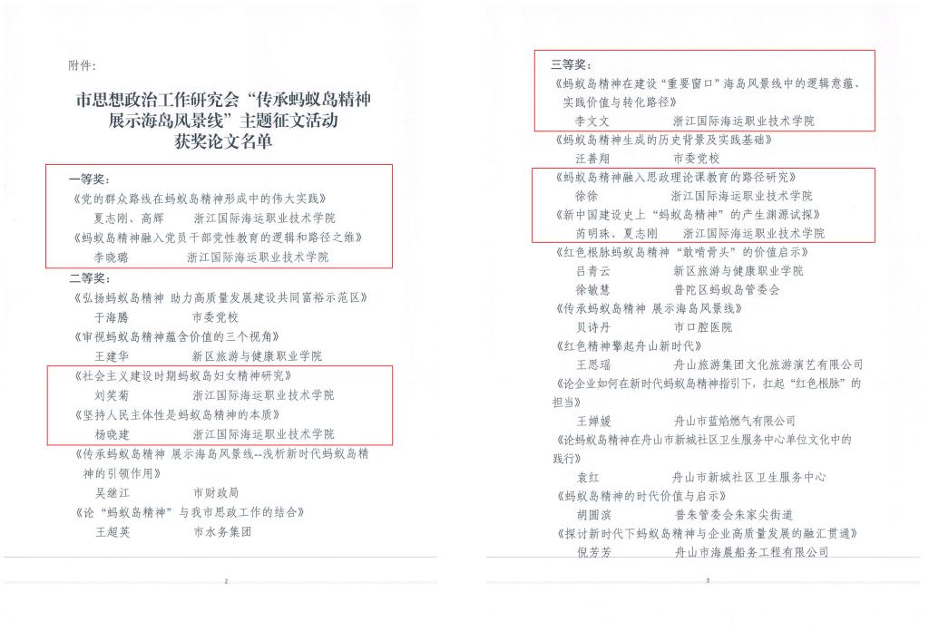 夏志刚、高辉老师撰写的论文《党的群众路线在蚂蚁岛精神形成中的伟大实践》、李晓璐老师撰写的论文《蚂蚁岛精神融入党员干部党性教育的逻辑和路径之维》等荣获一等奖;刘笑菊老师撰写的论文《社会主义建设时期蚂蚁岛妇女精神研究》、杨晓建老师撰写的论文《坚持人民主体性是蚂蚁岛精神的本质》等荣获二等奖;李文文老师撰写的论文《蚂蚁岛精神在建设“重要窗口”海道风景线中的逻辑意蕴、实践价值与转化路径》、徐徐老师撰写的论文《蚂蚁岛精神融入思政理论课教育的路径研究》、芮明珠、夏志刚老师撰写的《新中国建设史上“蚂蚁岛精神”产生的渊源试探》等荣获三等奖。