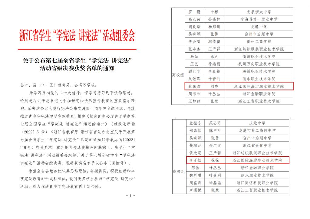 近日,浙江省学生“学宪法 讲宪法”活动组委会公布了《第七届全省学生“学宪法 讲宪法”活动获奖名单》。我校由刘晓老师指导的国际教育学院蔡康鑫同学和徐徐老师指导的海洋装备工程学院李子怡同学分别获得高校组演讲比赛、知识竞赛三等奖,取得了该项比赛的新突破。