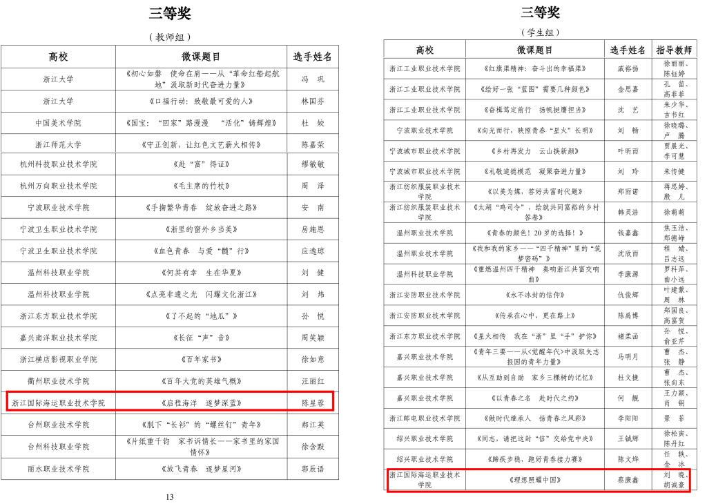 近日,由共青团浙江省委、浙江省教育厅、浙江省学生联合会共同组织的2023年度浙江省高校思政微课大赛成绩公布。校团委联合党委宣传部广泛动员各二级学院师生参赛,经过校内选拔赛,最终选送了3名教师和3名学生参加省赛。