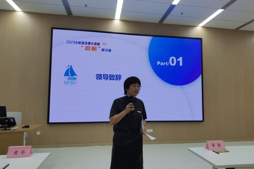 9月6日上午,学校举行2023年全校青年教师“启航”研习营开班仪式,仪式由教务处处长郑燕华主持。副校长李丽出席开班仪式并致辞,她带领教发中心、各教学单位分管负责人对新加入的36名青年教师表示热烈欢迎。她指出,教师队伍是发展职业教育的第一资源,是支撑新时代国家职业教育改革的关键力量。她希望教师们全力投入,学研融合,互动交流,注重实践,并从不一样的教育、不一样的学生、不一样的发展等三方面与青年教师进行了交流。