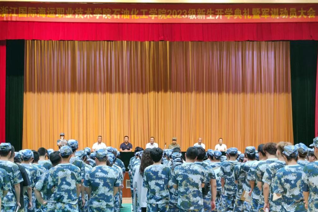 岱山校区在职教园区体育馆也同步举行了2023级新生开学典礼暨军训动员大会,石油化工学院全体班子成员、承训部队领导、全体参训师生参加。(学生处、石油化工学院)