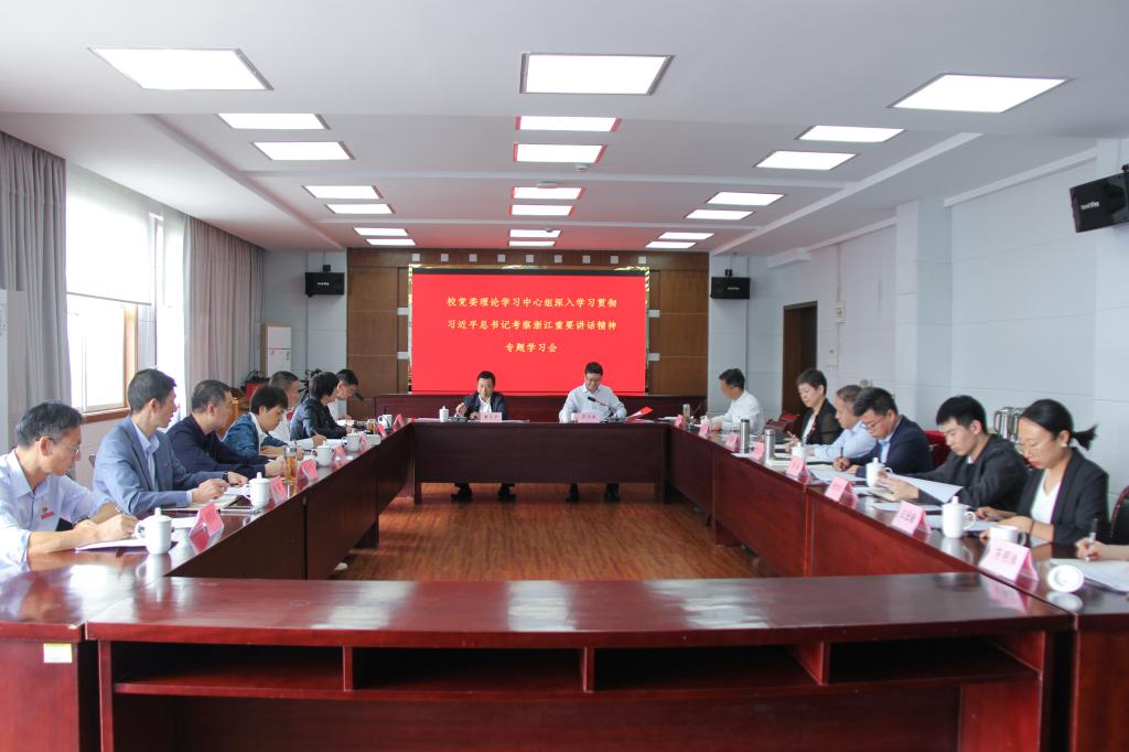 10月18日,校党委理论学习中心组在行政楼401会议室举行了2023年第9次集体学习会。会议主题是学习贯彻习近平总书记在浙江考察时的重要讲话精神,推动全校上下迅速兴起学习宣传贯彻热潮,激励广大师生坚定信心团结奋斗,推动学校高质量发展,为忠实践行“八八战略”,奋力谱写中国式现代化浙江新篇章凝心聚力。省委主题教育巡回督导组组长黄志平、金哲希同志,市委主题办副主任徐宝俊、王佳翰同志到会指导。