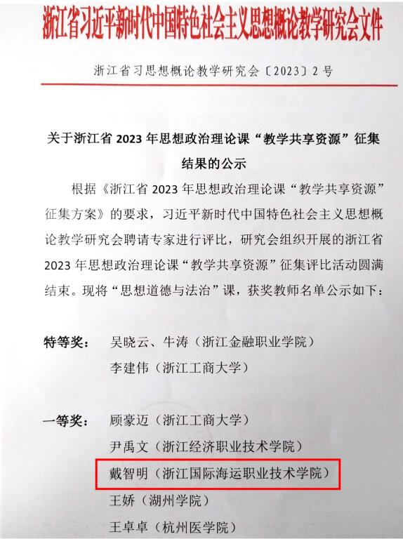 12月8日,由浙江省习近平新时代中国特色社会主义思想概论教学研究会组织开展的浙江省2023年思想政治理论课“教学共享资源征集”评比活动揭晓,我校马克思主义学院戴智明老师获得《思想道德与法治》课“教学共享资源征集”一等奖,熊孜老师获得《形势与政策》课“教学共享资源征集”三等奖。