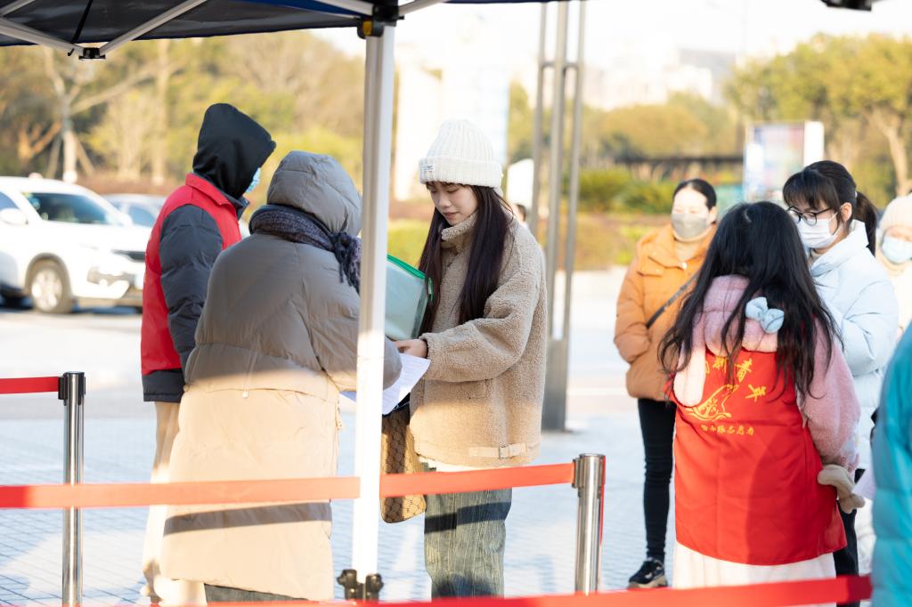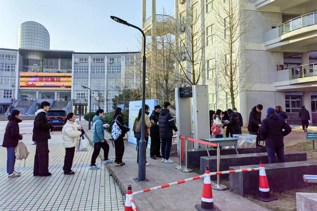 教务处协同各二级学院考务负责同志带头履职、靠前指挥、坚守一线,不仅确保了充足的人员到岗,更是认真对待和完成每一项考务工作。学校从机关职能部门组建了一支10余人的党员突击队,校团委选拔了30余人的学生志愿者队伍,为考生提供物品监管、身份核验、路线引导等服务。考场周边设置了详细的考场分布图、入场导引图与指示牌,安排考务人员进行引导,学生和党员志愿者为考生提供服务,确保考生顺利参加考试。考试期间,正逢我市遇上极端寒潮,学校在图书馆四楼教发中心设置专门的考生休息室,供应热水,方便考生中午休息,通过各项便利服务,用心用情保障研考工作安全平稳。