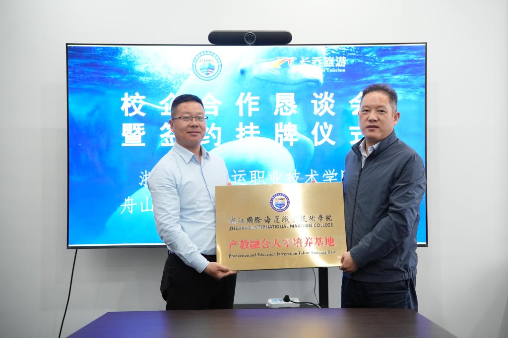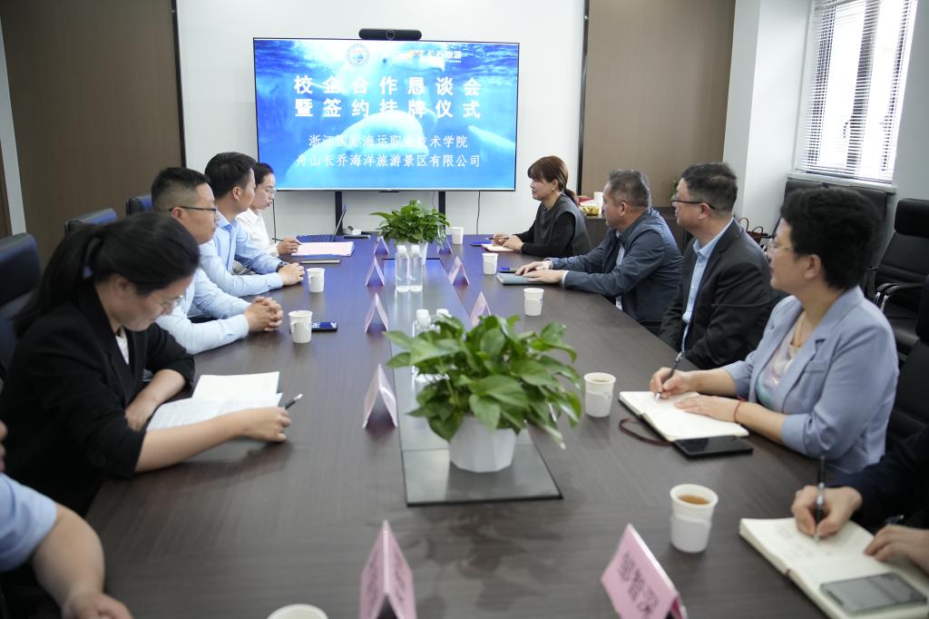 为进一步深化产教融合,提升学校服务地方贡献度,5月16日,我校与舟山长乔海洋旅游景区有限公司在公司园区举行校企合作签约仪式暨产教融合人才培养基地授牌仪式。校党委书记苏为泽,党委委员、副校长曹志斌,海洋旅游学院院长黄灵霞、党总支书记陈宋芳和专业教学团队负责人邹智深,舟山长乔公司董事长张小雄、人资总监李师师、人资经理唐珍珍等共同参加。