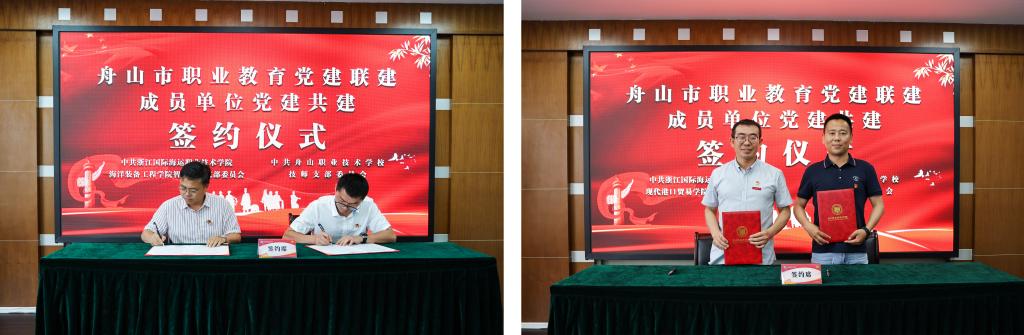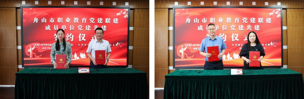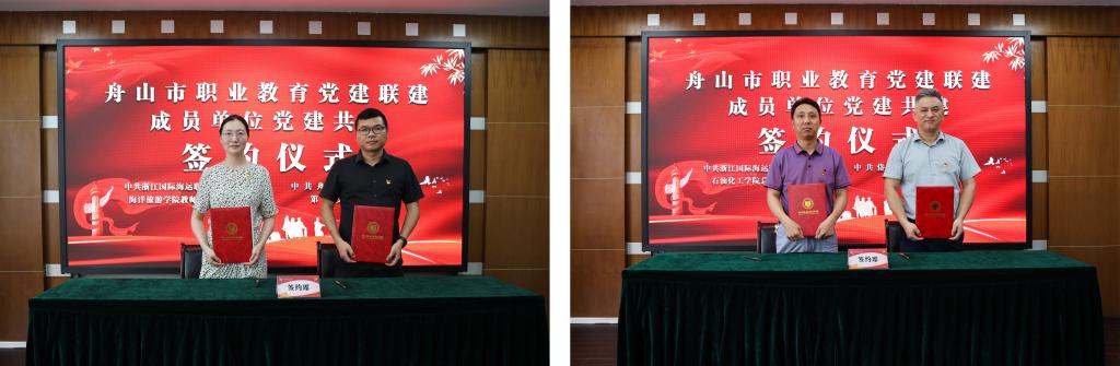会上,我校海洋装备工程学院智能制造党支部与舟山职业技术学校技师党支部、现代港口贸易学院数字党支部与舟山航海学校第三党支部、海洋旅游学院教师党支部与舟山旅游商贸学校第一党支部、石油化工学院党总支与岱山县职业技术学校党支部、浙江舟山群岛新区旅游与健康职业学院商务学院党总支与舟山旅游商贸学校党总支部、舟山群岛新区旅游与健康职业学院旅游学院教师党支部与嵊泗职业技术教育培训中心党支部签订院校支部党建共建协议。