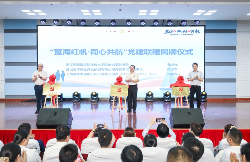 在现场师生共同见证下,航海工程学院党总支、中共舟山市人才发展集团有限公司支部委员会、中共上海浦东发展银行舟山分行总支部委员会签署党建共建协议。校党委副书记孔志光、舟山海投公司党委书记田力军、浦发银行舟山分行行长张春龙共同为“蓝海红帆·同心共航”联建项目揭牌。三方将整合教育、人才、金融资源,在航海专业人才培养、船员职业发展、产业生态优化等领域深化合作,构建常态化协同机制。