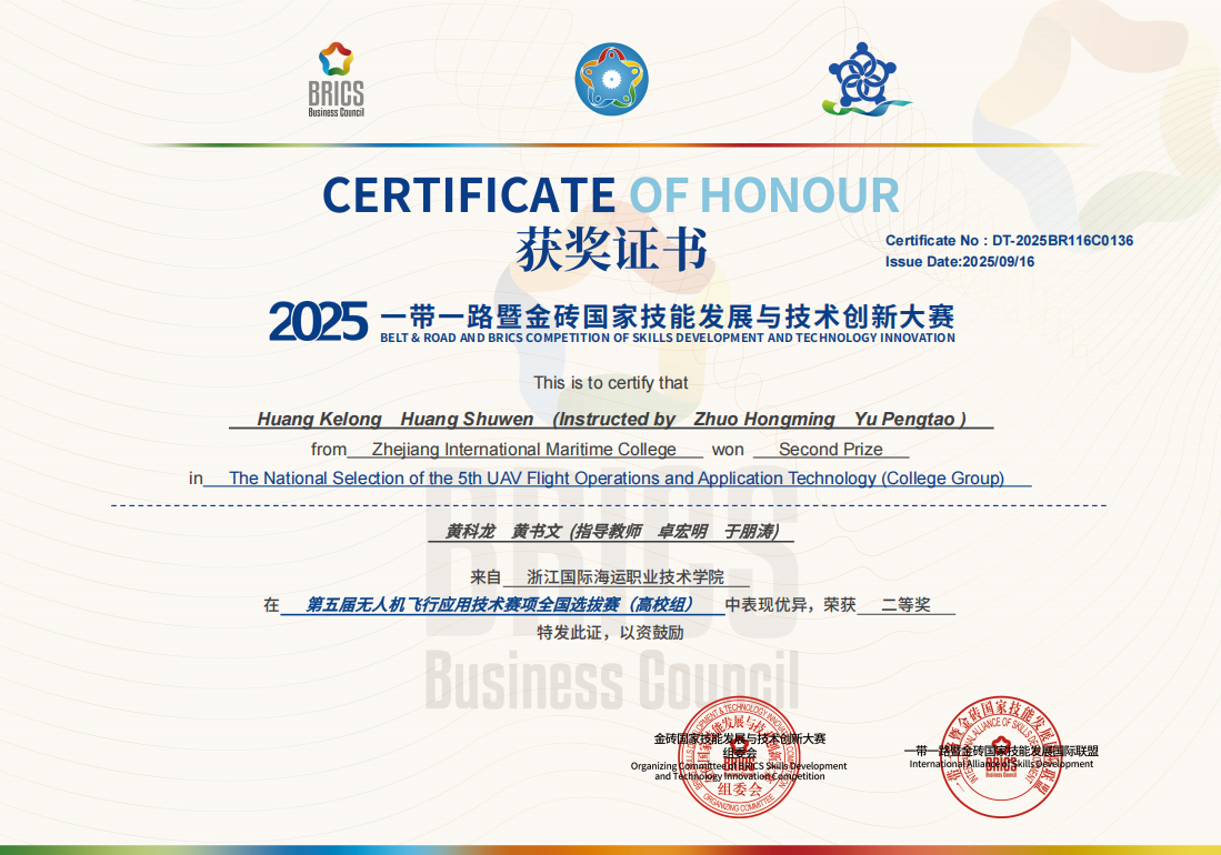 为备战此次赛事,我校参赛师生赛前深耕专业知识、反复打磨实操技能,以充分的准备迎接挑战。比赛中,我校师生凭借扎实的专业功底与稳定的临场发挥崭露头角:教师组中,施鑫煜老师斩获一等奖,王庆老师获二等奖;学生组方面,由卓宏明、于朋涛老师指导的两支队伍表现亮眼,2024级无人机应用技术专业黄书文、黄科龙组成的1队,以及2024级船舶工程技术专业王金宇与2024级无人机应用技术专业林秦烨组成的2队,均获二等奖。其中,施鑫煜老师与学生1 队成功晋级全国决赛。