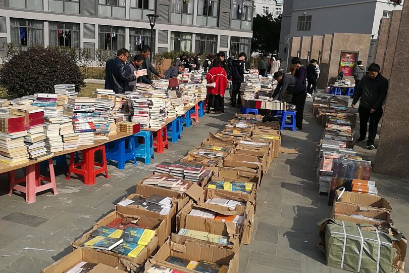 12月12日中午,我校图书馆与江苏书商在学生食堂商贸区联合举办图书展销活动。冬日的暖阳照着堆放整齐的推理小说、中外名著、人文经典等各类图书,吸引了大批师生驻足阅读、交流、购书,在学校掀起了一股浓厚的读书热潮。