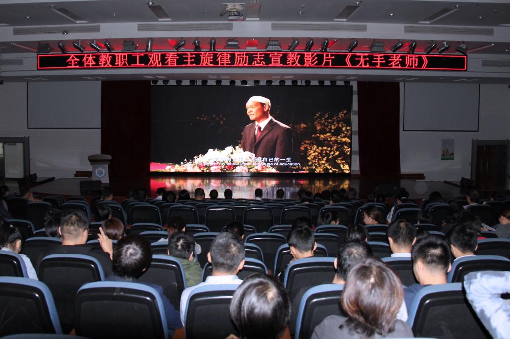 为全面贯彻习近平新时代中国特色社会主义思想和党的十九大精神,深入落实习近平总书记关于宣传思想工作系列重要讲话精神,进一步加强社会主义核心价值观建设,10月31日下午,学校组织全体教职工集中观看主旋律励志宣教影片《无手老师》。