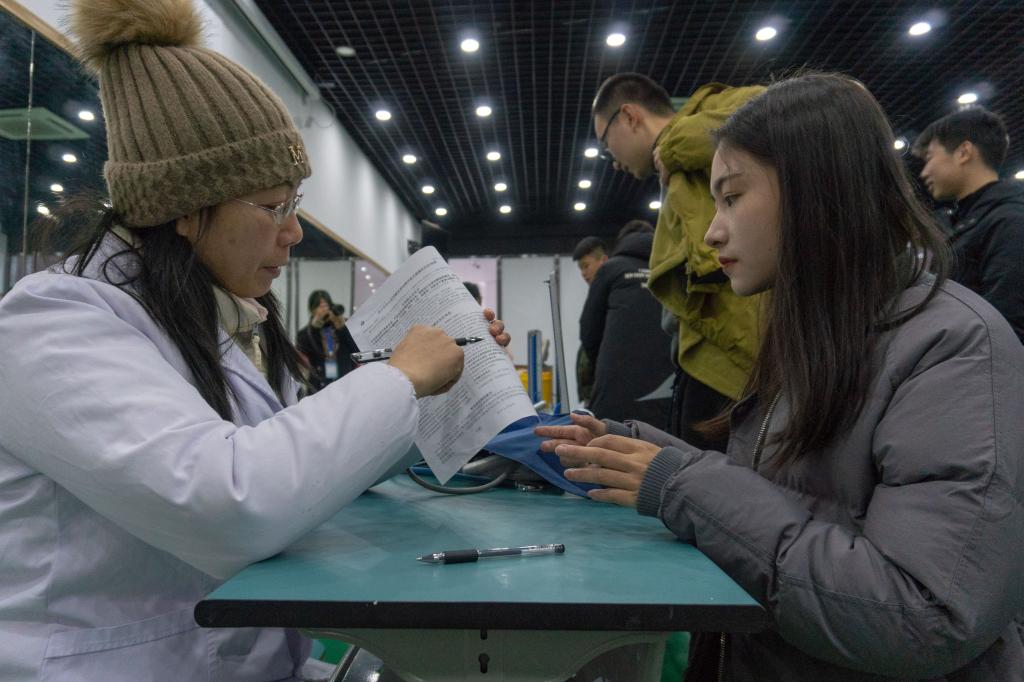虽然天气寒冷,但同学们的献血热情不减。下午1点,献血准时开始,大家先在图书馆一楼舞蹈房排队进行填表报名、体检、初筛,随后依次登上采血车,撸起袖子献出热血。