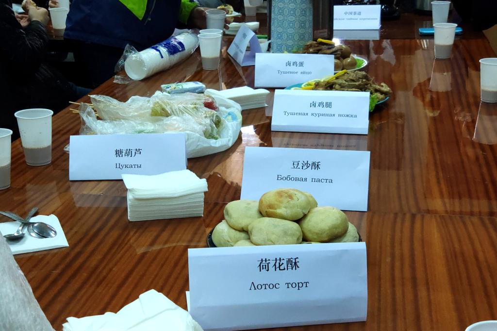 经过前一天的精心准备,我校留乌学生制作了豆沙酥、绿豆糕、冰糖葫芦、卤鸡腿等中国传统小吃。当一盘盘精美的小吃摆放到桌上时,乌克兰学生发出了惊喜声,当他们一样一样品尝完之后,更是对中国的传统小吃赞不绝口,“Вкусно, очень вкусно!(好吃,太好吃了!)”除了北京烤鸭,他们了解了更多的中国传统美食,在品尝过程中,留乌学生耐心地向他们介绍了中国的传统食物,不同的地方又有哪些不一样的美食特色,乌克兰的学生们个个都听得聚精会神,时不时发出一声声惊叹声和赞美声。
