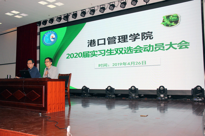 为进一步完善毕业生实习工作,引导学生做好实习心理准备,4月26日晚,港口管理学院在图书馆四楼报告厅召开了2019年毕业生实习招聘动员大会。学院党总支书记苏峰、副院长何伟、全体辅导员、2017级3年制与2018级2年制的682名实习生参加会议。