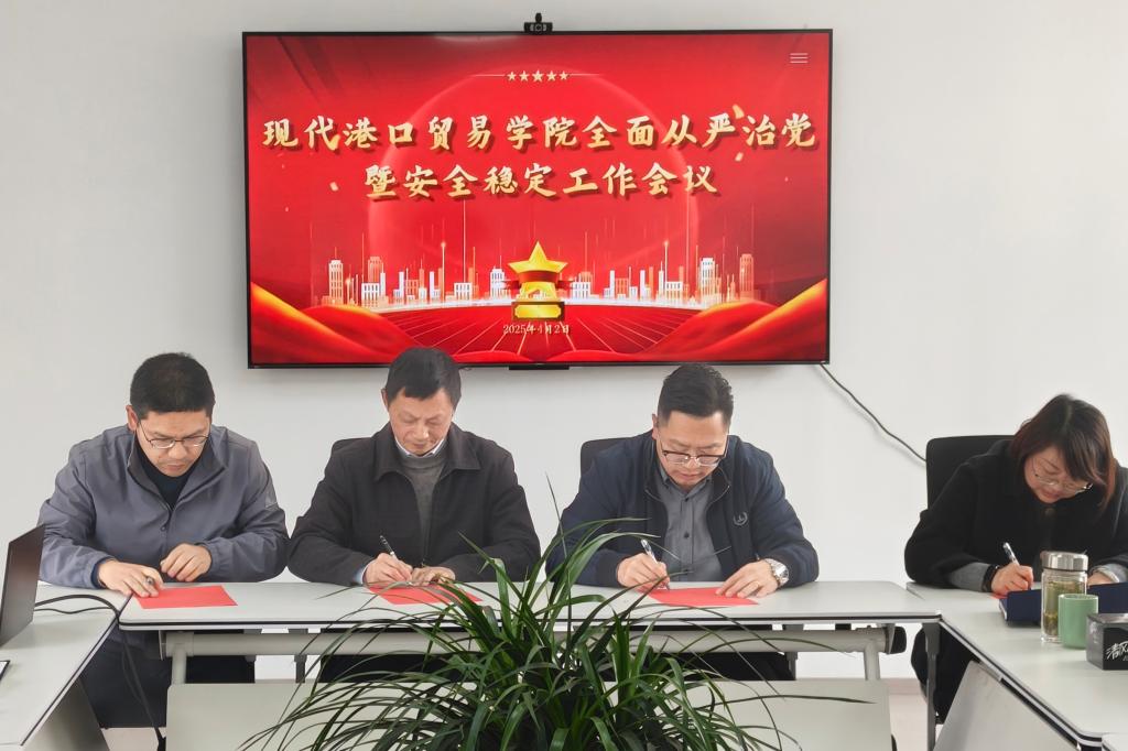 会上,学院与相关人员签订了党风廉政责任书和安全管理责任书。(现代港口贸易学院)
