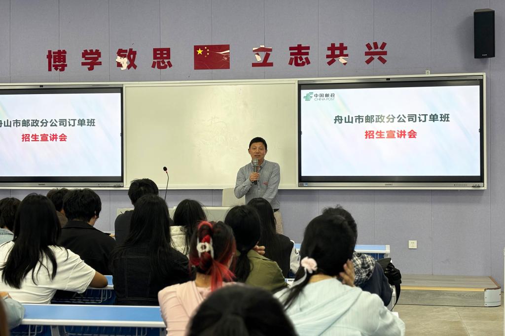 5月7日,现代港口贸易学院、海洋旅游学院联合舟山市邮政分公司,在图书馆四楼举办了“邮政订单班”校企合作宣讲会。活动以“深化产教融合,服务地方经济”为核心,吸引近百名师生到场。校企双方通过政策解读、就业前景分析及互动答疑等方式,为学生搭建职业发展桥梁,彰显出职业教育服务区域经济的使命。