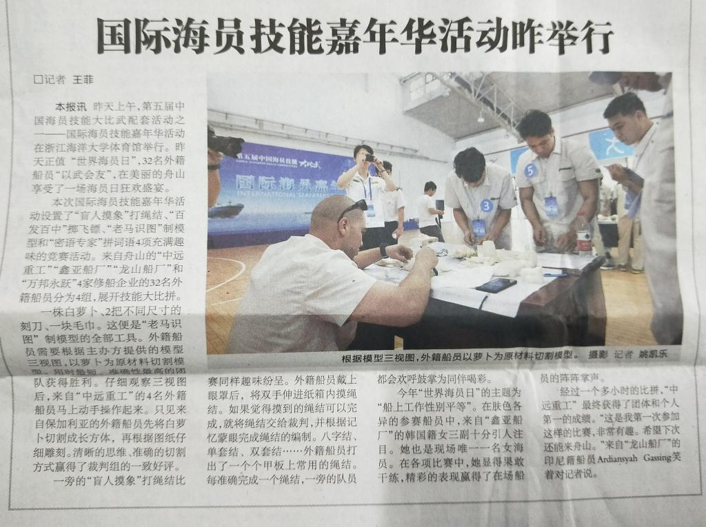 今年“世界海员日”的主题为“船上工作性别平等”。在肤色各异的参赛船员中,来自“鑫亚船厂”的韩国籍女三副十分引人注目。她也是现场唯一一名女海员。在各项比赛中,她显得果敢干练,精彩的表现赢得了在场船员的阵阵掌声。