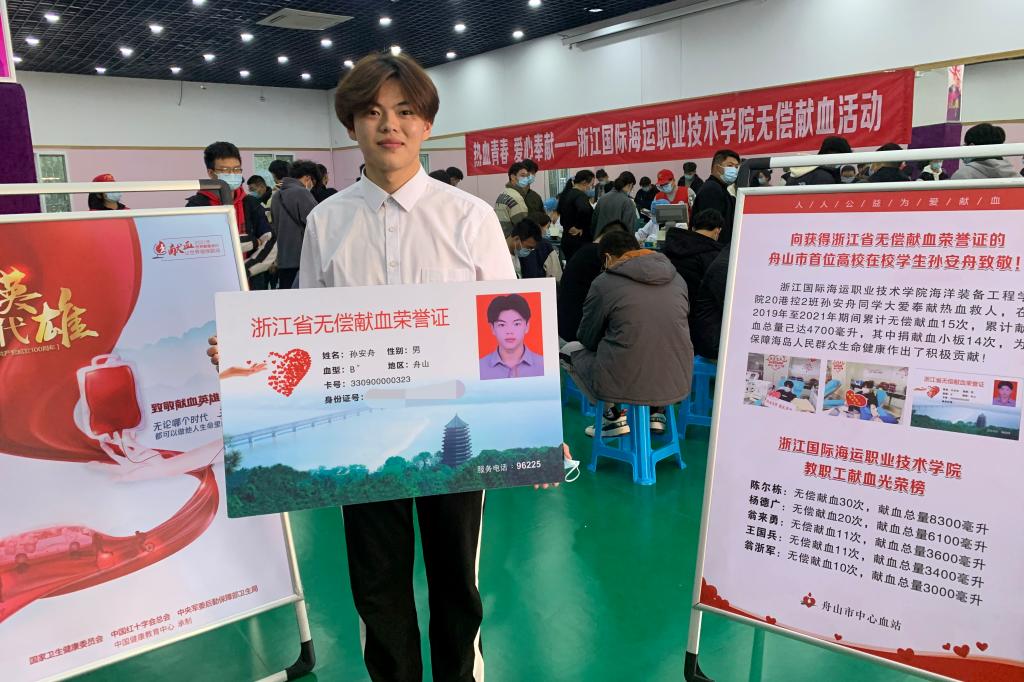 2019年10月一天,孙安舟和同学路过定海檀枫小学门口时,遇到流动无偿献血车,两人第一次献了血。“我是B型血,那次献了300毫升,后来参加无偿献血的次数多了,才知道在咱们舟山,A型和O型用血比较多,特别是A型血经常告急。”孙安舟说。
