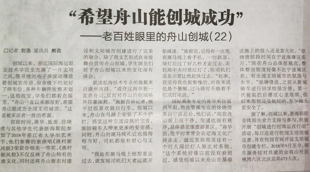 据了解,创城以来,浙海职院全体师生全力支持与参与,积极开展“创城进行时海运在行动”活动,每日还进行校园文明创城巡查,并在校园官网开设文明城市创建专栏。2018年9月至今,师生服务结对共建的金鸡山社区桃湾六区北区总共673人次。